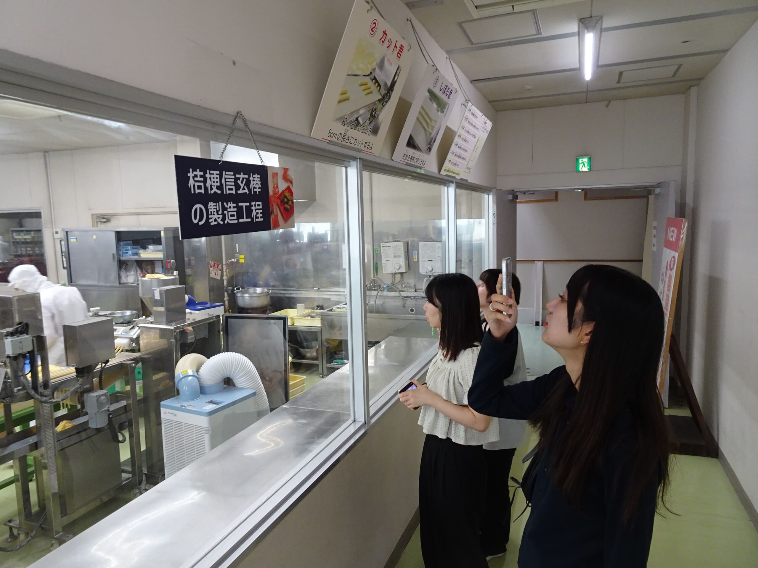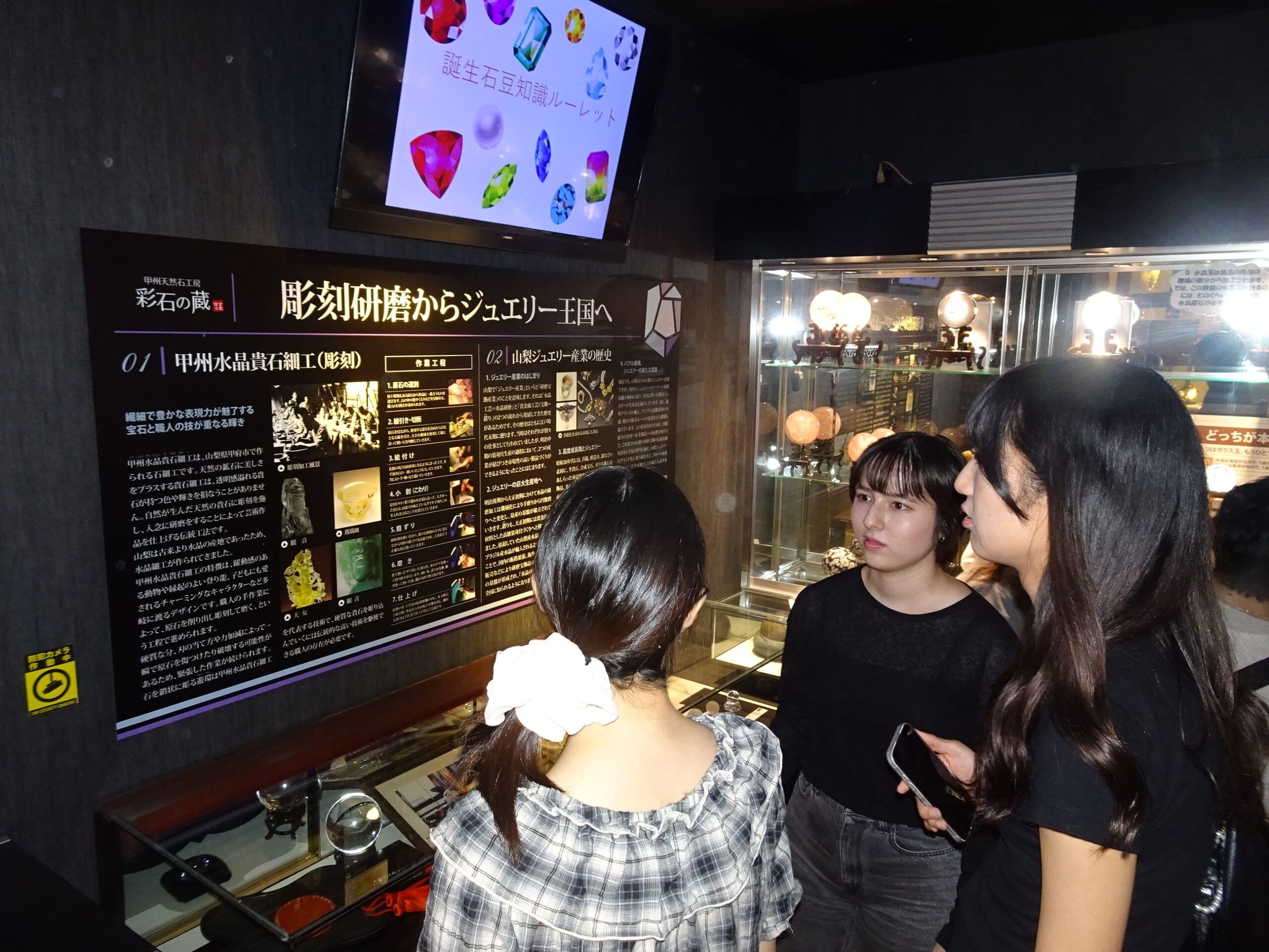 訪問先では、山梨中央銀行金融資料館(甲府市)や山梨県立博物館で甲州財閥の歴史や金融の発展を学び、地域経済と風土との関わりを理解しました。また、地域を代表する産業として、人気の土産菓子「桔梗信玄餅」の製造工場や、地域の宝飾産業の歴史を伝える甲州天然石工房採石の蔵を見学。施設見学の際には、館内スタッフの方から様々な質問をすることで、展示を閲覧する以上の学びを得ることができました。連休中ということもあり、多くの観光客で賑わう様子から、地域産業と観光のつながりを実感しました。